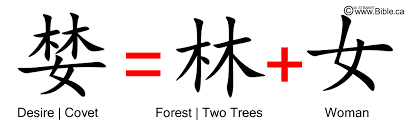 Chữ "tham" gồm có 3 chữ: Trên có hai chữ "mộc" là hai cây trong vườn Ê-đen, dưới có chữ "nữ" là phụ nữ.